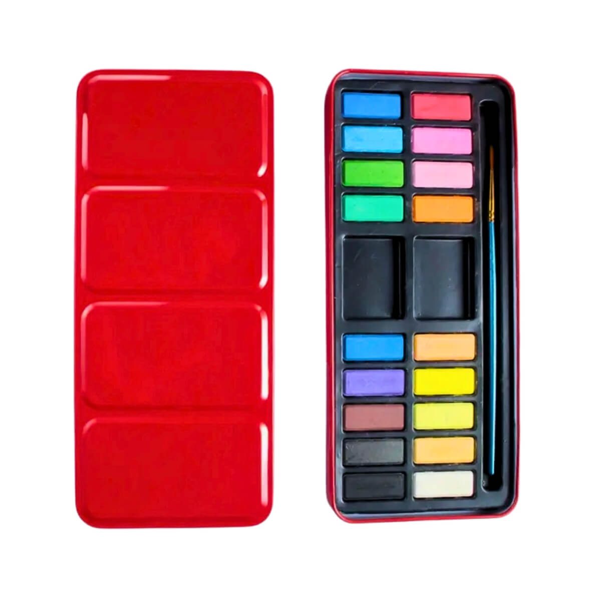 Set de acuarelas portátiles de 18 colores en caja metálica con pincel, listas para crear desde cualquier lugar.