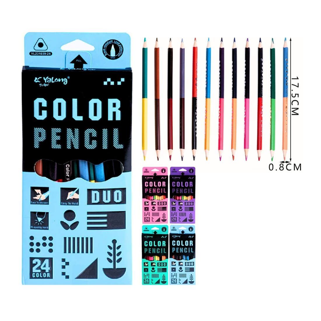 Con los Lápices Bicolor DUO de Yalong obtienes 24 tonos intensos dentro de solo 12 cuerpos. Cada lápiz incorpora dos puntas opuestas con mina blanda de 3 mm que se desliza sin esfuerzo sobre papel, cartulina o cartón.