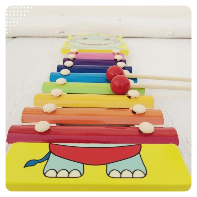 Hermoso metalófono hipopótamo de madera y metal con 2 baquetas con 8 notas musicales, con el cual el niño podrá estimular la coordinación, oído musical, motricidad fina, creatividad y desarrollo del lenguaje artístico, siendo