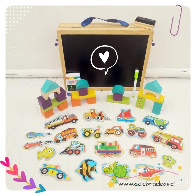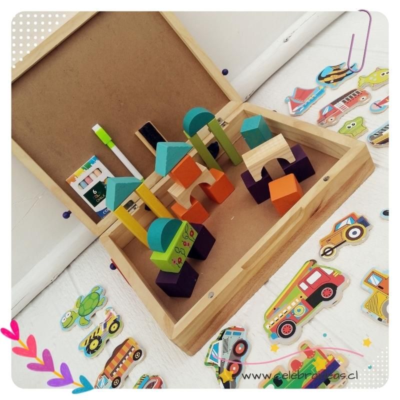 Pizarra didáctica doble tipo maletín es un hermoso juguete didáctico de madera, especial para variadas etapas del desarrollo de los niños y niñas, tiene un alto potencial educativo. La maleta transportable que se cierra con broches e imanes, por una cara contiene una pizarra para tiza de color negro y por la cara contraria, una pizarra magnética. En su interior contiene 20 bloques de madera y 20 figuras imanados con varias temáticas, además de tizas, plumón y borrador.