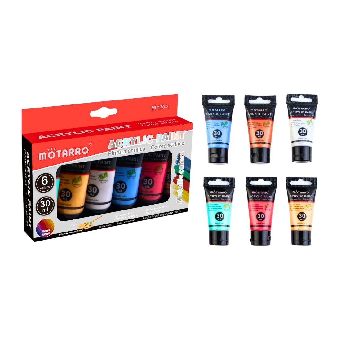 • Set de 6 pinturas acrílicas Motarro de 30 ml con acabado metálico intenso y alta cobertura para proyectos artísticos y manualidades.