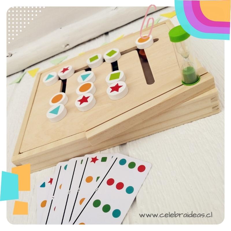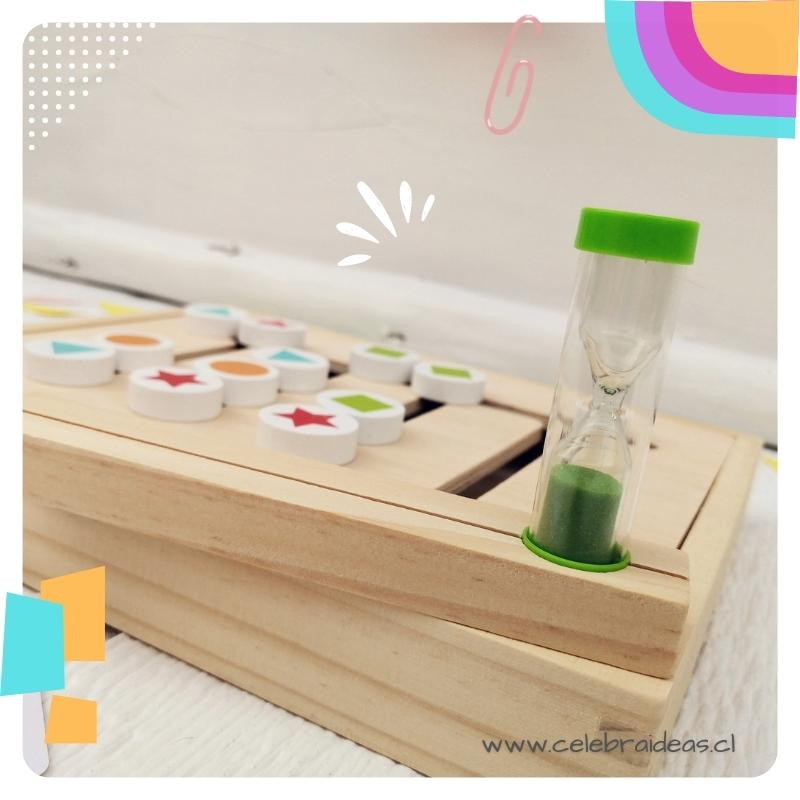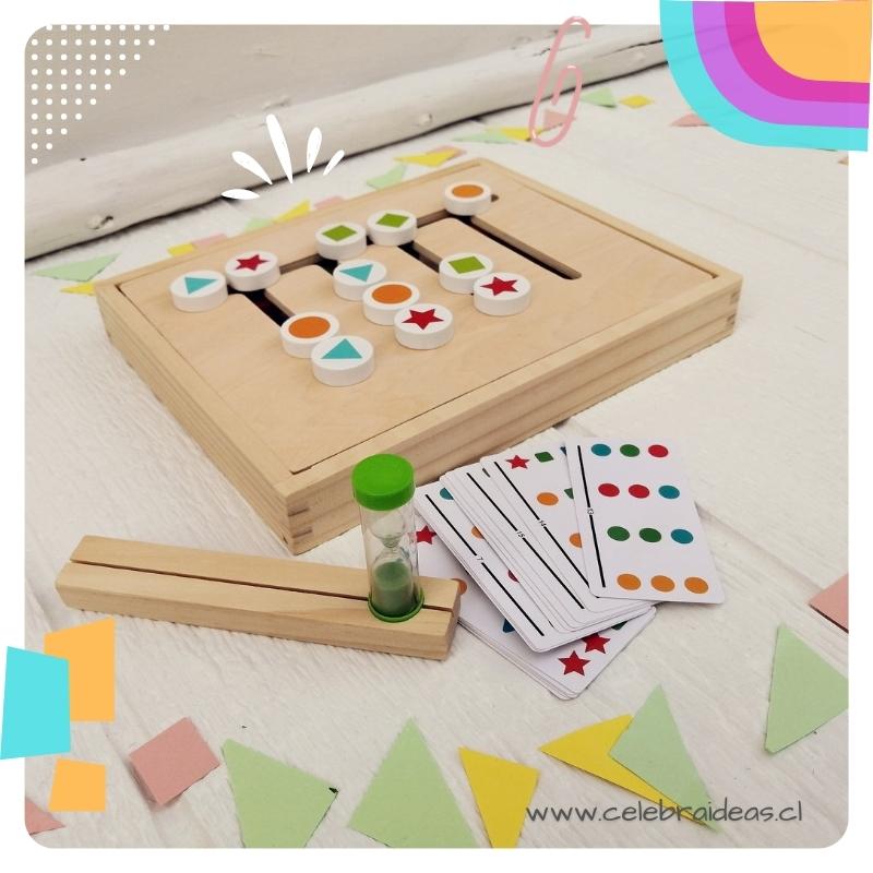 • 1 caja con tablero doble cara con fichas con figuras geométricas